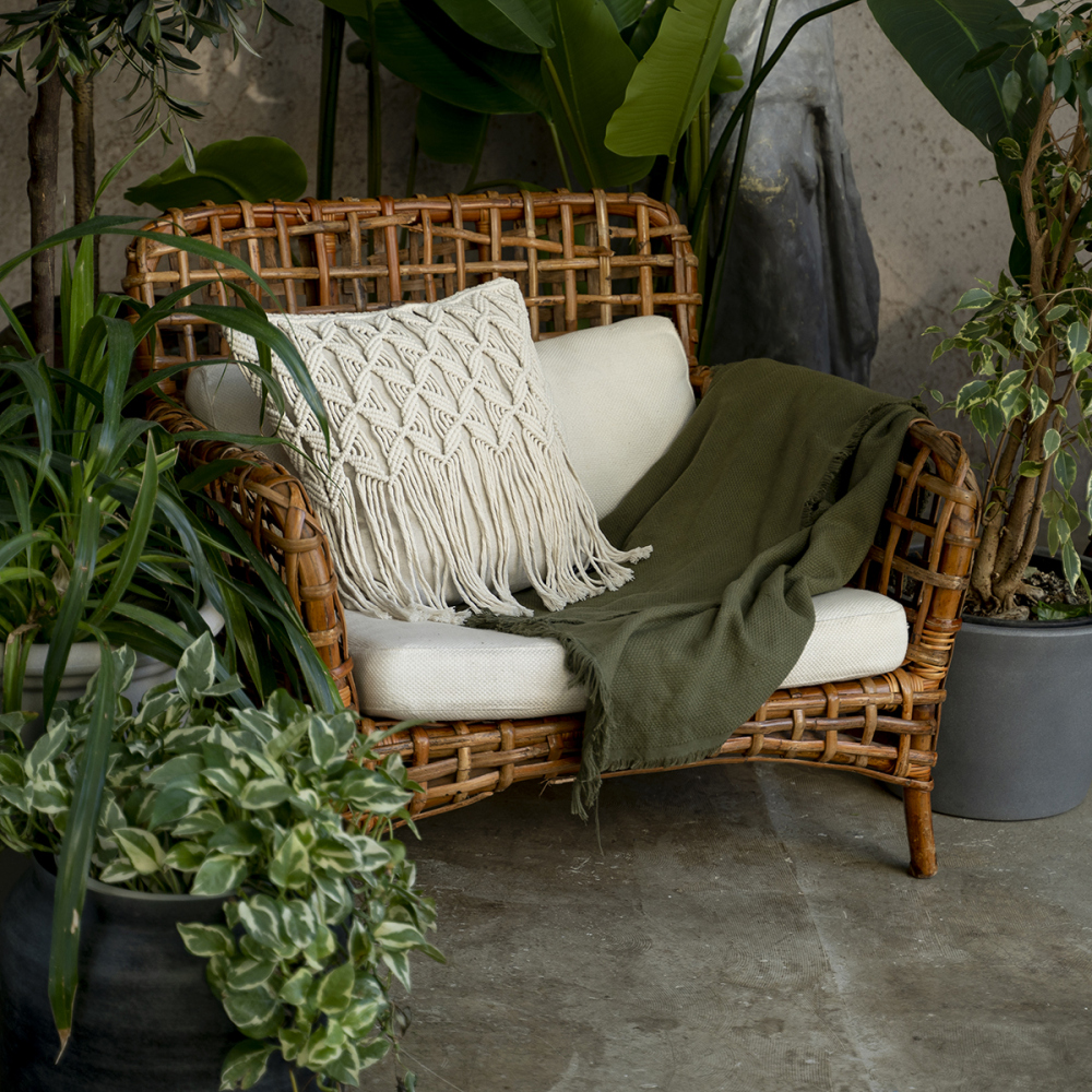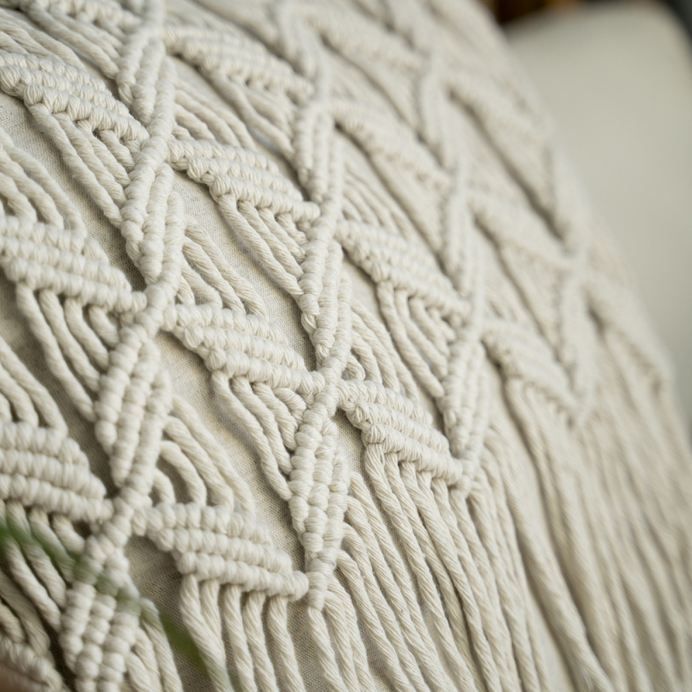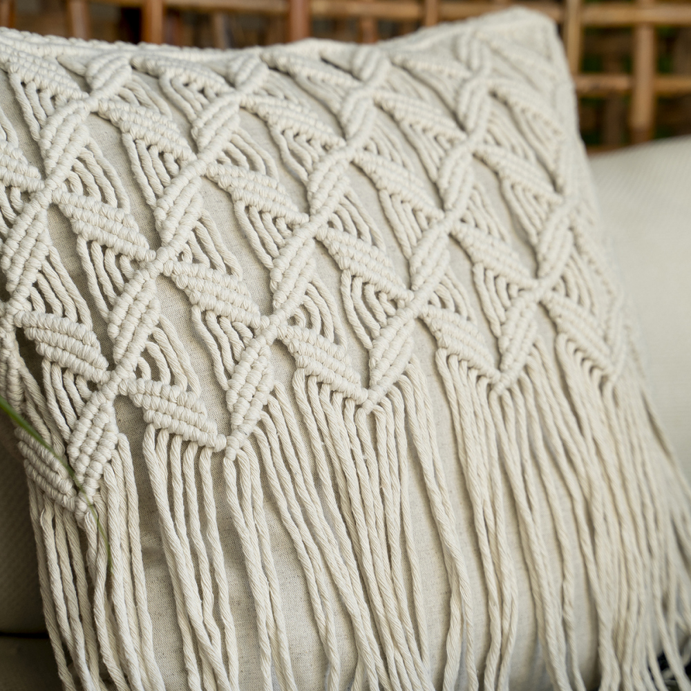 Декоративная подушка из натуральной ткани, дополненная ручной работой по макраме. Сделано в России