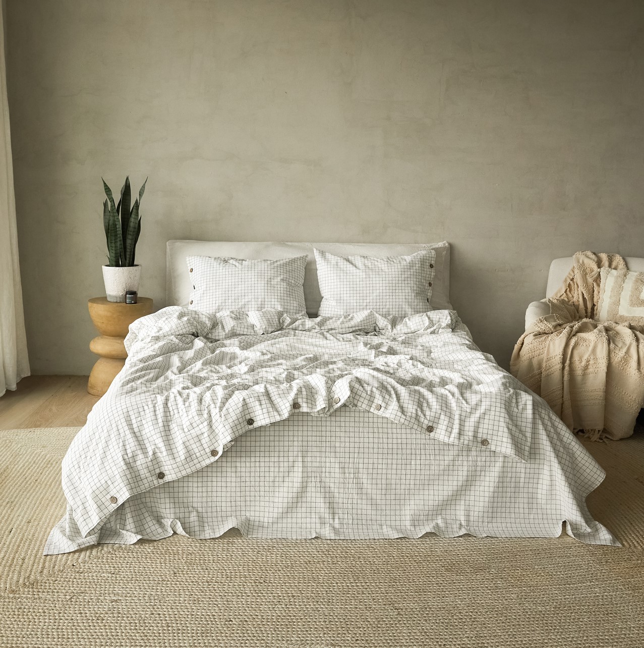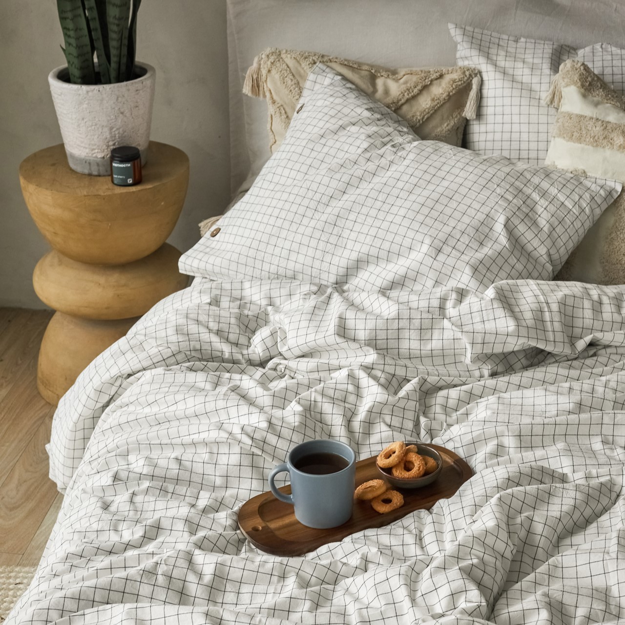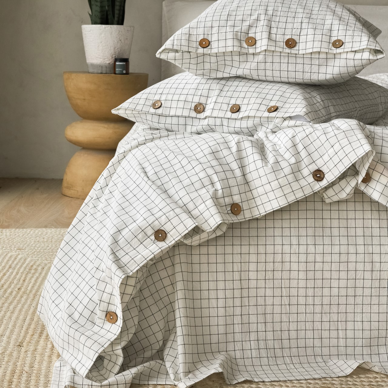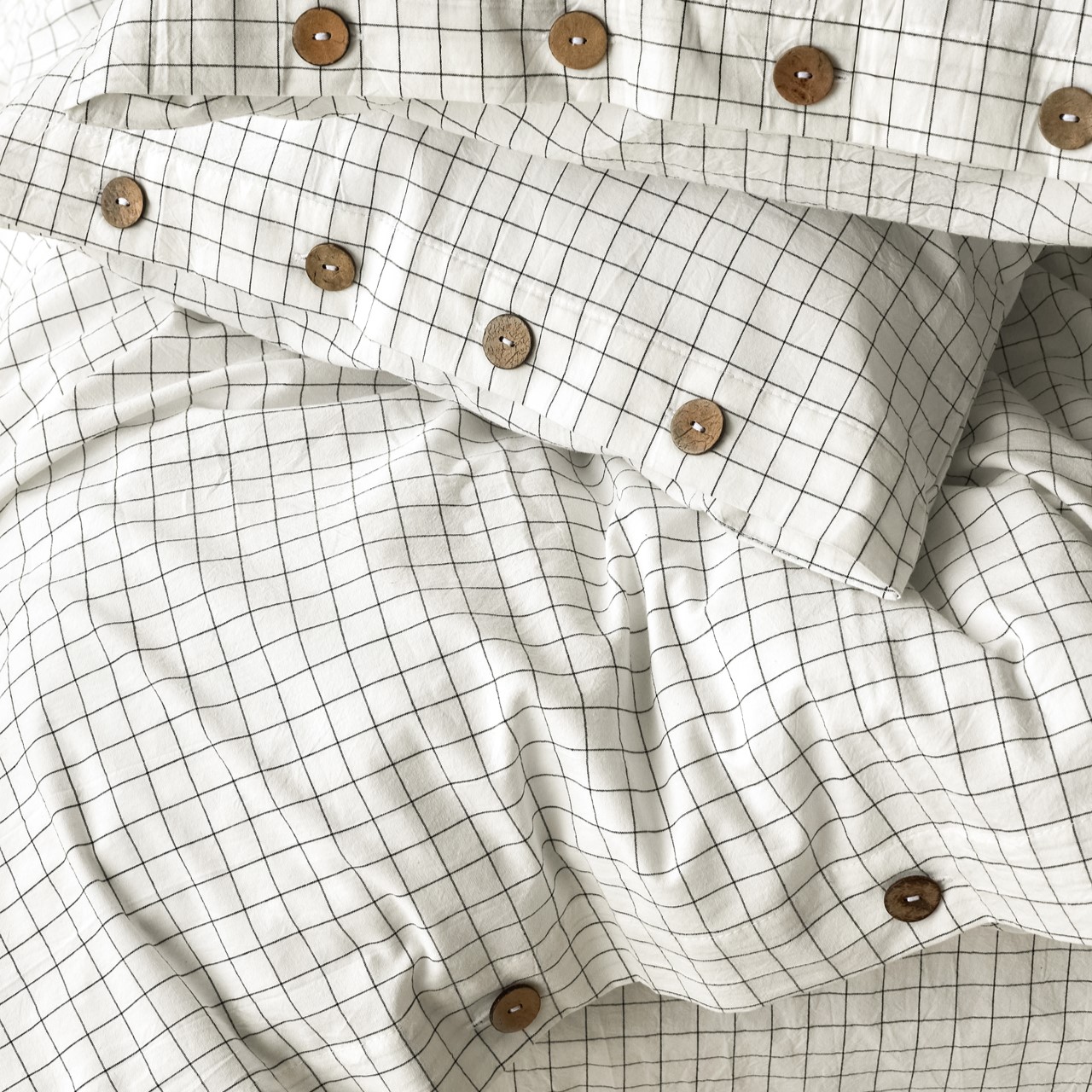 Комплект постельного белья из 100% натурального вареного хлопка Scandi (сканди) – принт клетка в теплом белом оттенке в сочетании с кокосовыми пуговицами для ценителей скандинавского минимализма.