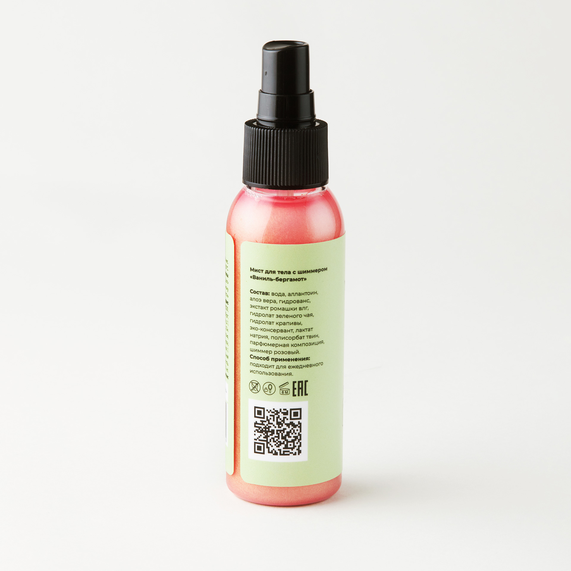 Воплощение гармонии и роскоши в одном флаконе. В составе: алоэ вера, экстракт ромашки, гидролат зеленого чая и крапивы, розовый шиммер. Каждое распыление окутывает кожу нежным ароматом ванили и бергамота, создавая атмосферу уюта и тепла. Мерцающие частицы розового шиммера добавляют красивый блеск. Флакон объемом 100 мл с удобным распылителем, легко носить в сумочке или дорожной косметичке. Распылите мист на чистую кожу после душа или ванны, уделяя особое внимание участкам, которые хотите подчеркнуть мерцанием (плечи, декольте, ноги).