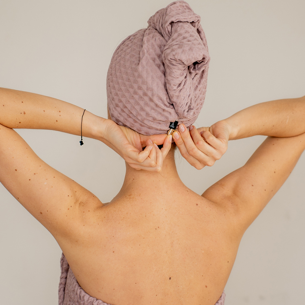 Полотенце для волос из натурального вафельного полотна. Чалма дополнена надежным креплением на пуговицу, поэтому она не спадает пока вы занимаетесь домашними делами. Полотенце быстро и бережно впитывает воду не нанося вред вашим волосам и коже головы. СОберите ваш уютный домашний комплект дополнив чалму килтом, домашними тапочками и косметичкой из коллекции "Тори". Состав - 100% хлопок.