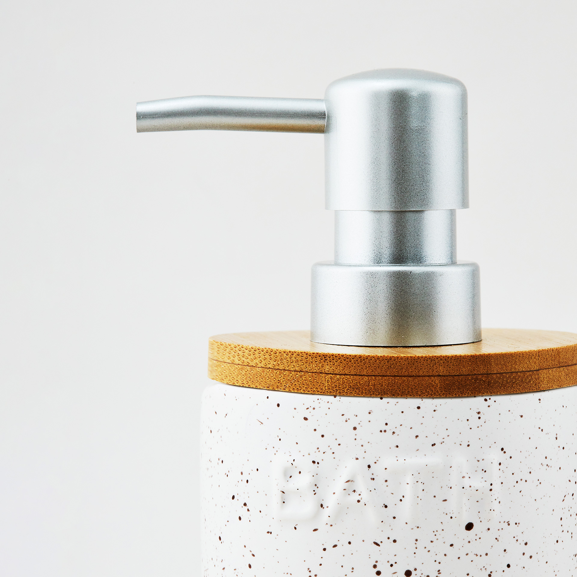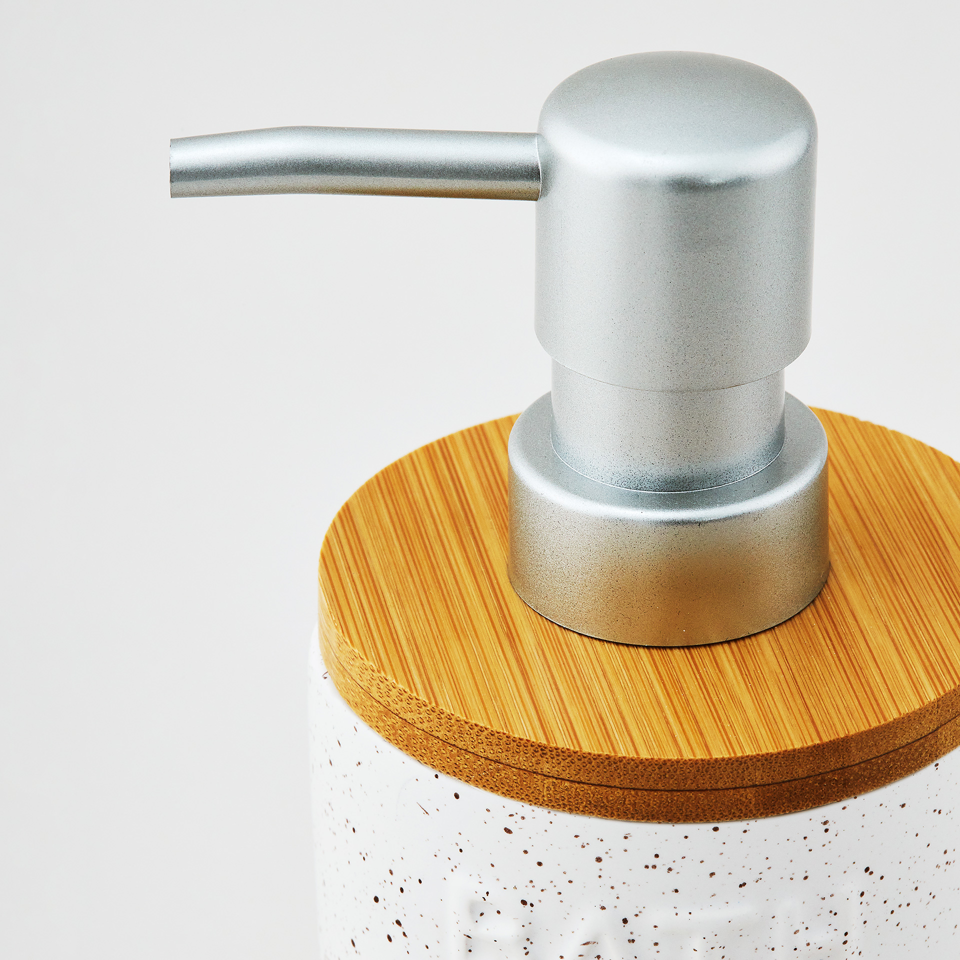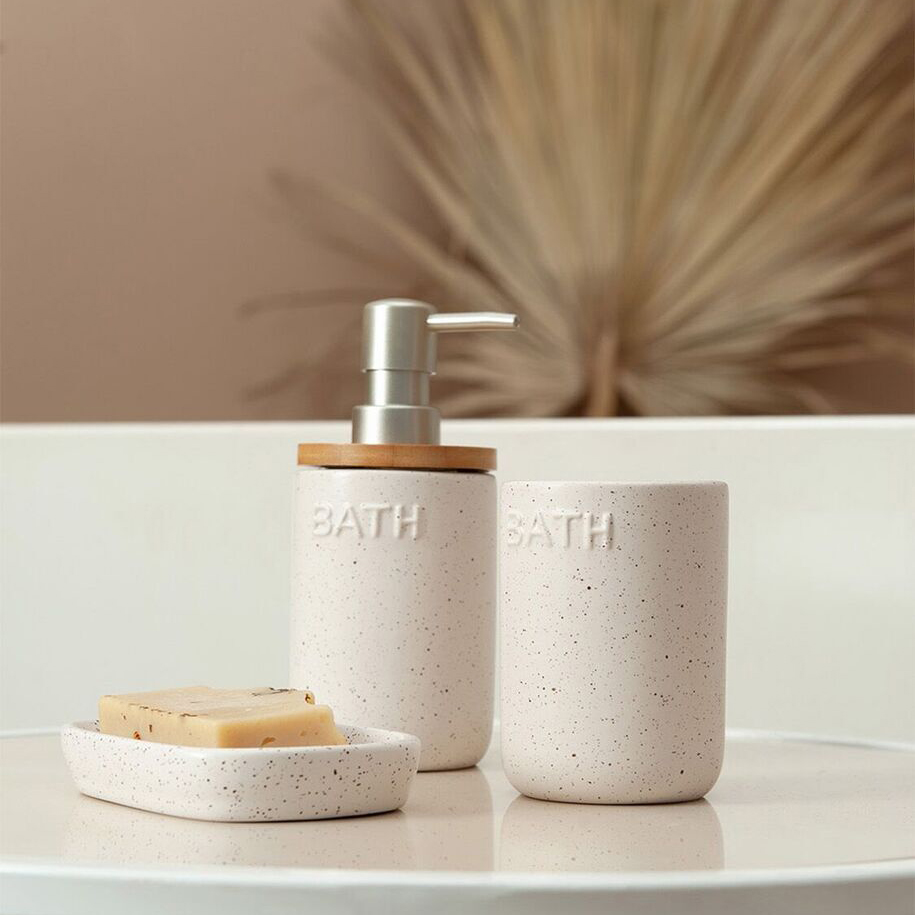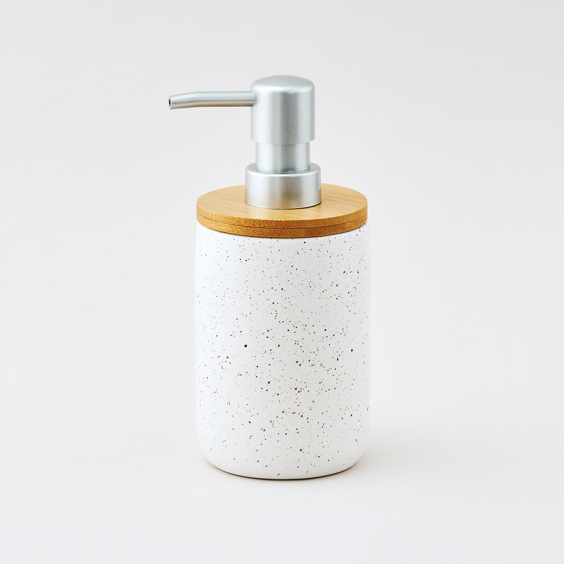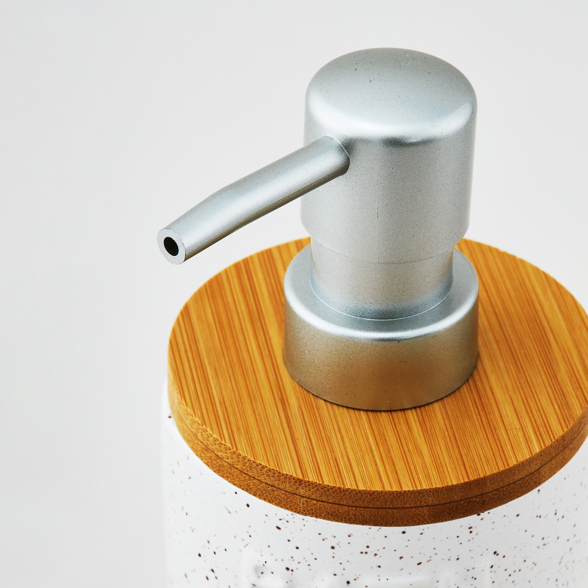 Стильный интерьерный диспенсер для жидкого мыла выполнен из качественной керамики, в молочном цвете с темно-бежевым крапом и декорирован натуральным бамбуком. Сочетание цветов и фактур напоминает о чудесном отпуске-ретрите , именно поэтому коллекция получила свое название - Каникулы на Бали. Декорирование дома предметами, напоминающими об отпуске - один из ярких трендов. Дозатор дополнен классической серебряной помпой с матовым покрытием. Конструкция помпы обеспечивает комфортное нажатие. Поверхность диспенсера не только визуально красива, но и приятна на ощупь. Благодаря гладкой поверхности уход за изделием прост и не займет много времени.